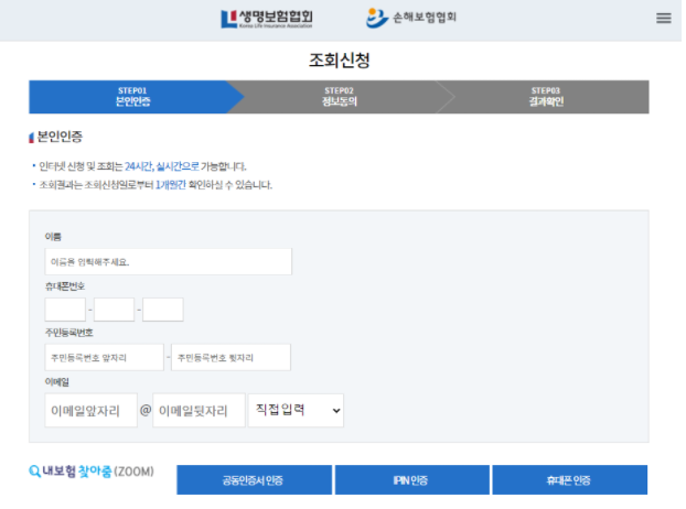 생명보험협회(cont.insure.or.kr)에서 공동인증서, IPIN인증, 휴대폰 인증을 통해 내보험 찾아줌 서비스 이용이 가능합니다.