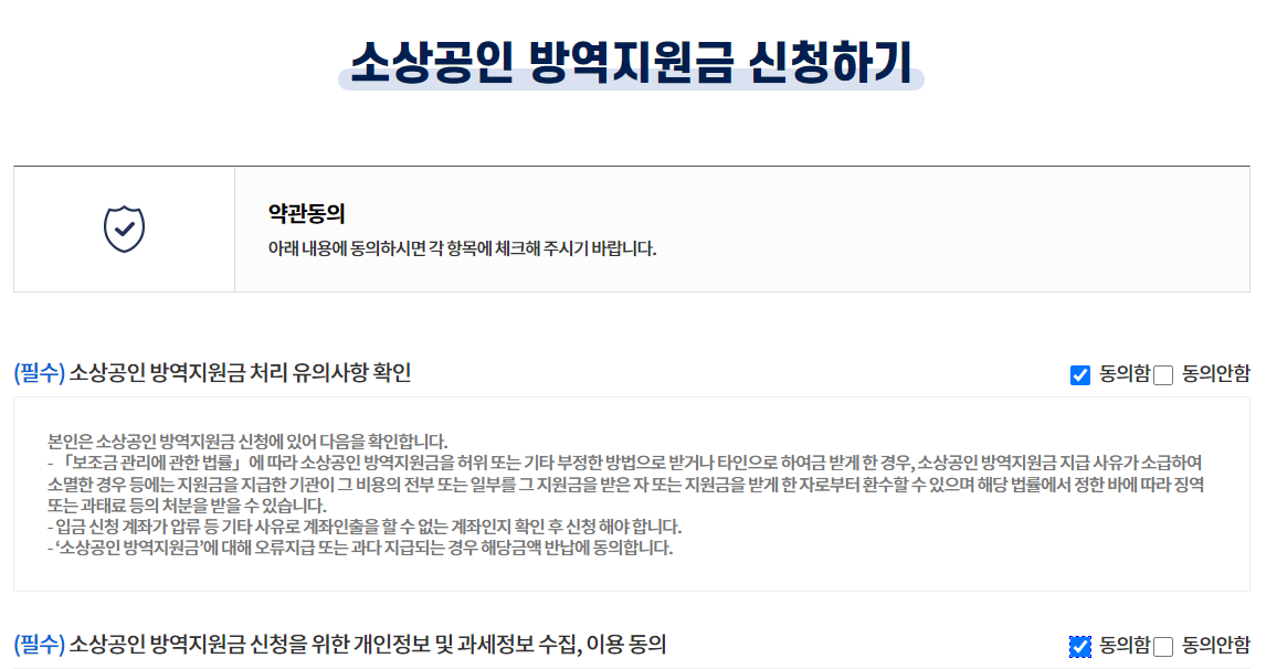 신청을 위해 동의를 누르고 방역지원금 신청 절차를 거쳐주세요.