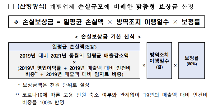 단, 맞춤형 지원이기 때문에 매출감소액, 인건비, 방역조치 이행일수, 보정률등을 계산하여 보상이 이루어 집니다.