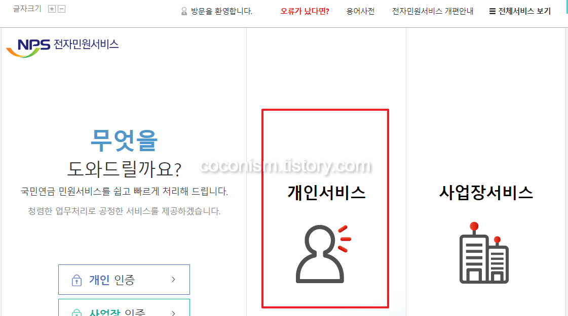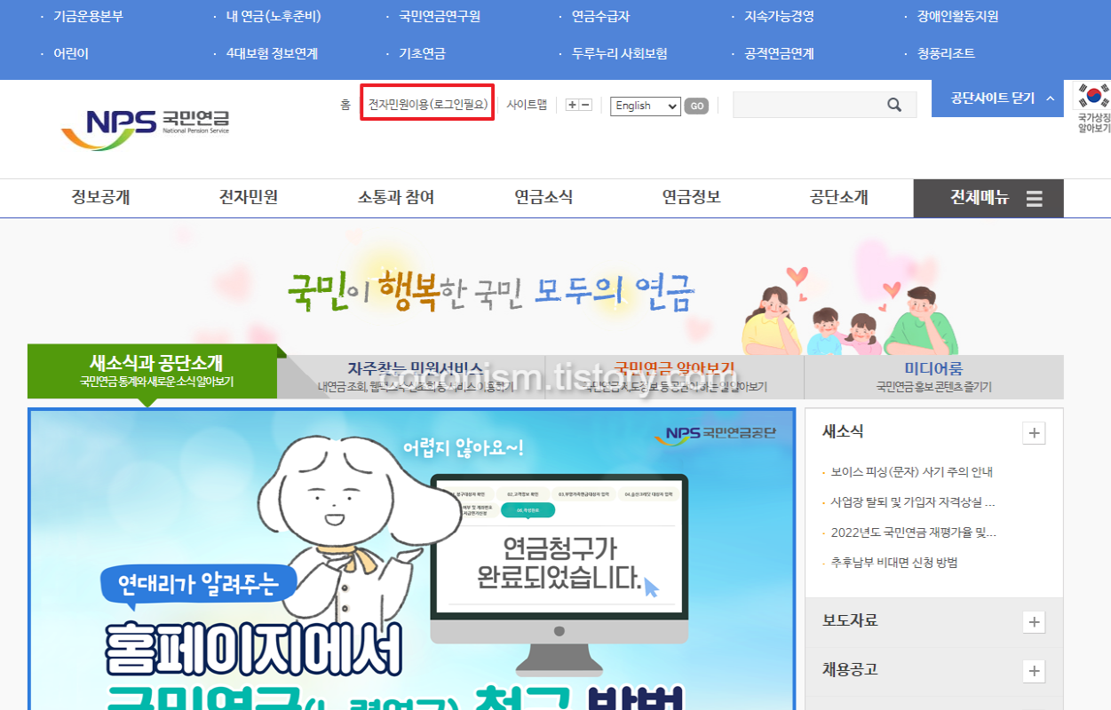 1. 국민연금 NPS 전자민원서비스 공식홈페이지 (https://www.nps.or.kr/jsppage/main.jsp)