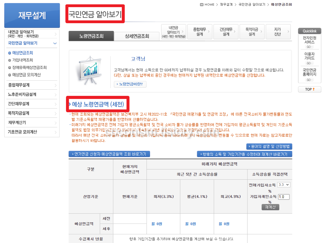 재무설계를 클릭하시고 국민연금 알아보기 클릭, 예상 연금 모의계산을 클릭하시면 기본정등을 입력하여 모의계산이 가능합니다.
